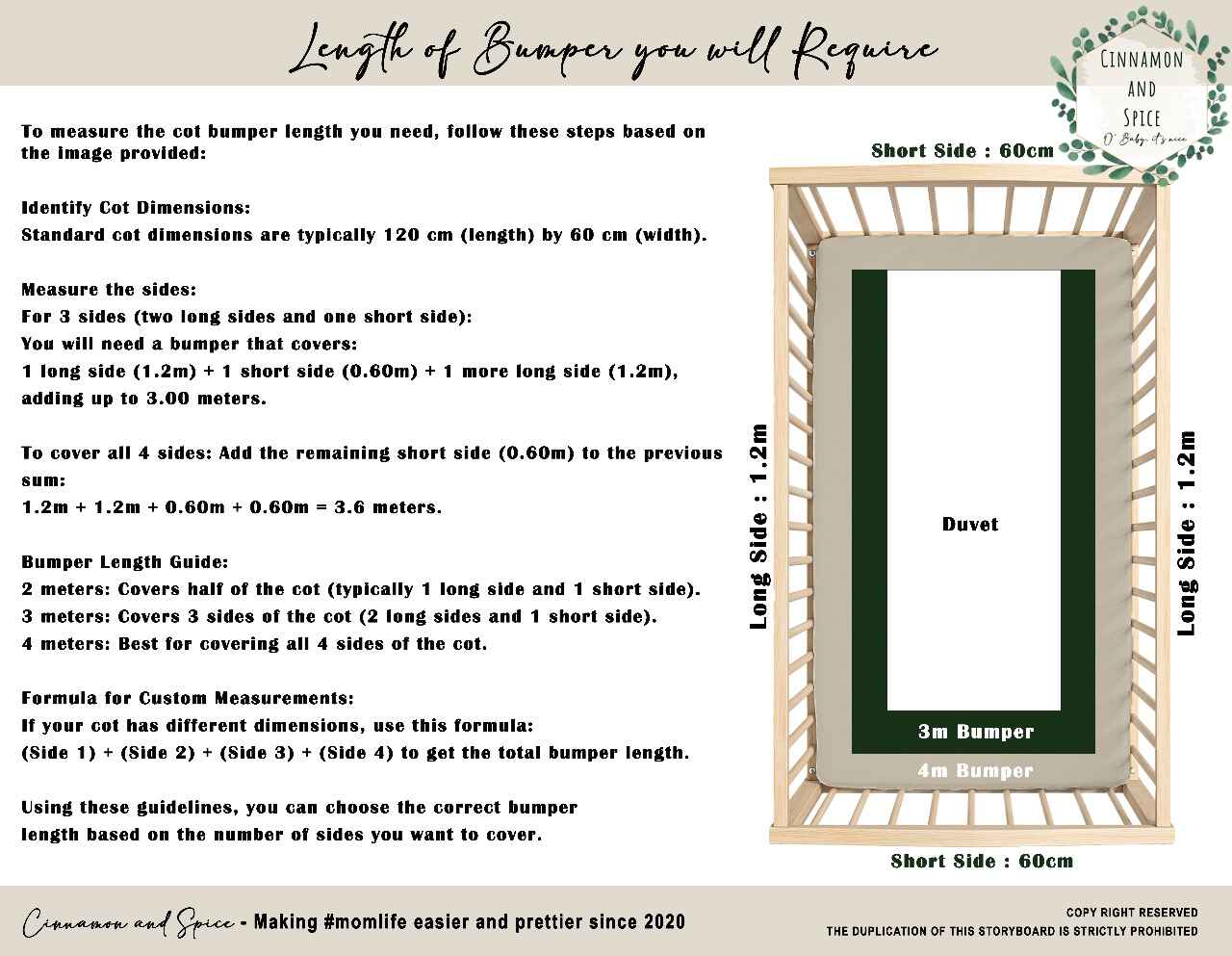 The length of the bumper you need depends on your mattress size. To cover three sides of the mattress (with pillows at the top), add the width + length + length. For example: 66cm + 132cm + 132cm = 3.3m, so a 3m bumper will cover almost the entire three sides. To cover all four sides, add width + length + width + length. For example: 132cm + 66cm + 132cm + 66cm = 3.96m, so a 4m bumper is ideal. Note: Bumpers are soft and flexible, so a few centimeters won’t make a noticeable difference.
