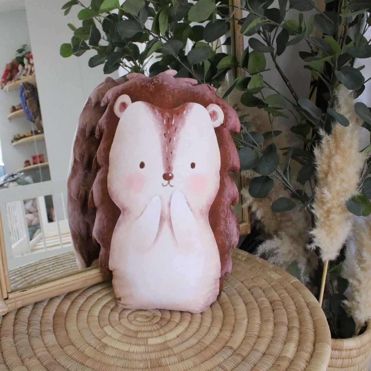 Shaped Pillow – Beige Woodlands Leaf and Tree – Hedgehog